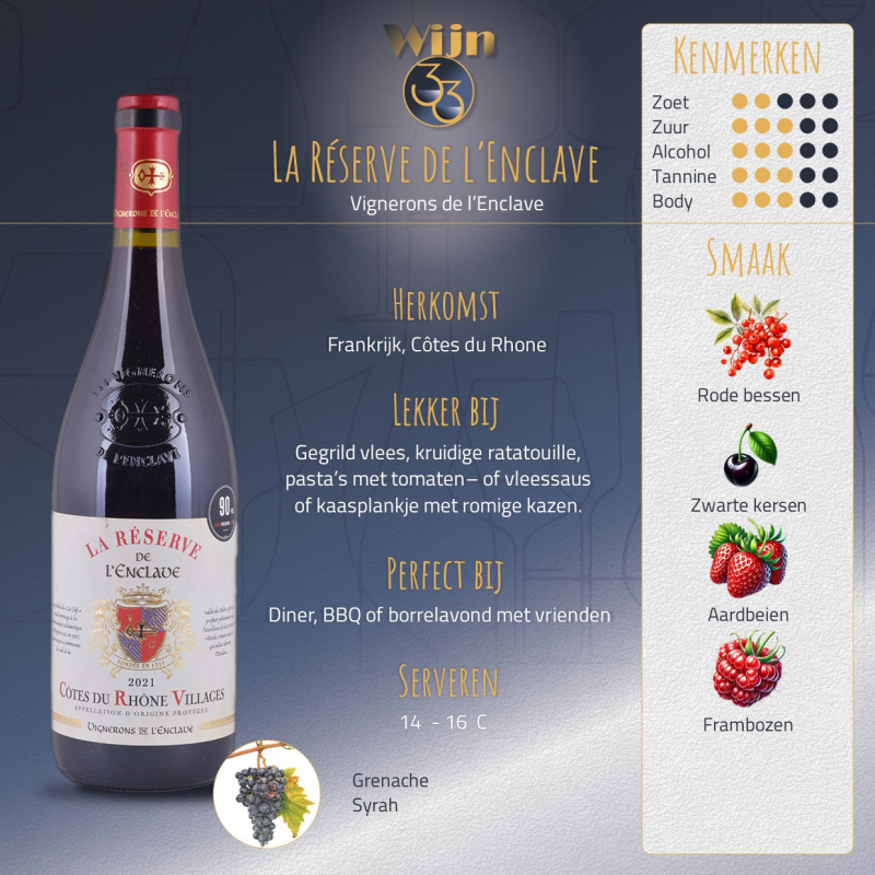 Deze charmante Côtes-du-Rhône is een heerlijke mix van rode vruchten zoals framboos en aardbei, met een vleugje kruidigheid en zachte, fluweelachtige tannines. Een vleugje peper en Provençaalse kruiden maakt de smaak extra verfijnd.
